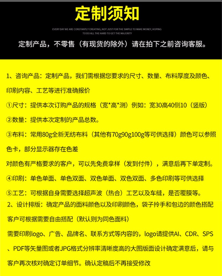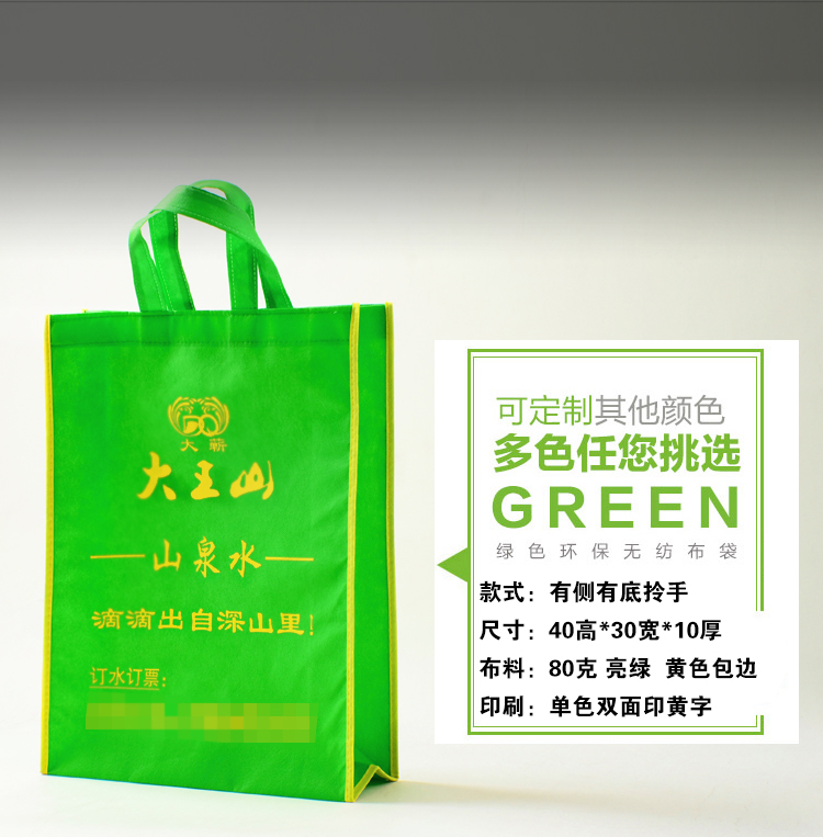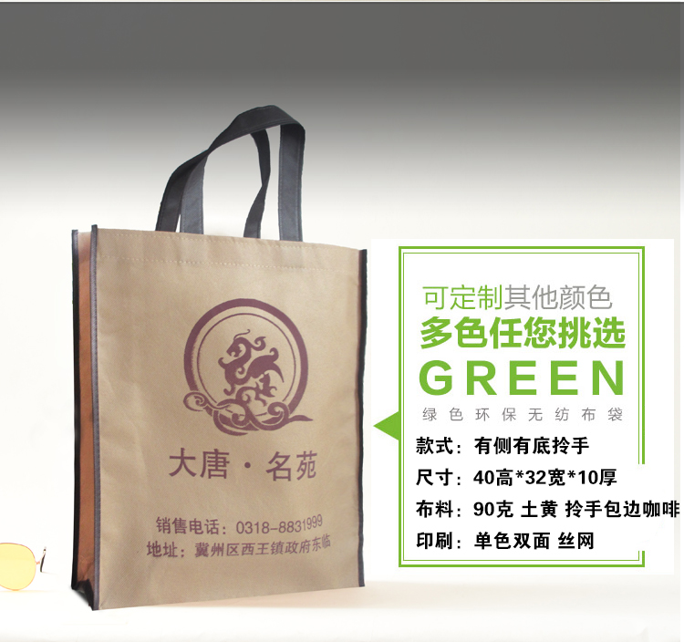 注意:我們是生產(chǎn)廠家 只要你提供:材質(zhì)(克數(shù))+規(guī)格尺寸+印刷色+款式或者圖樣等給我們,就可以準(zhǔn)確給您報價和 量身定做,歡迎來電詢價。(網(wǎng)上為象征性標(biāo)價,具體價格請?zhí)峁┮螅?lián)系客服報價。默認(rèn)報價 是不含運費的價格噢!) 訂購須知: 客戶在定制袋子時有以下選擇: 材料:無紡布克重在每平米45克——100克,顏色有幾十種任你選擇; 印刷:絲網(wǎng)印、機器印或者熱轉(zhuǎn)印,單面或者雙面印,單、雙色或多色等; 規(guī)格:規(guī)格可由客戶隨意來定,顧客在定做時,只要告訴我們長寬高,我們將為你量身打造; 款式:本店提供各式各樣的款式,供客戶參考對比。 聯(lián)系電話:15100318595 QQ:546326955