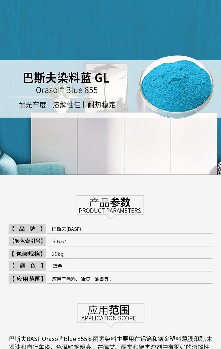 巴斯夫855酞菁藍(lán)染料翠藍(lán)色奧麗素金屬絡(luò)合染料溶劑藍(lán)70老型號(hào)807