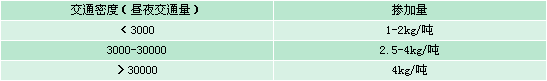 根據(jù)交通流量的大小,建議TB-Fiber纖維的摻加量(以每噸瀝青混合料為基準)